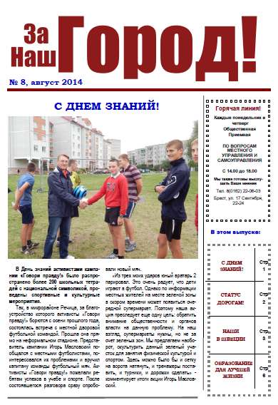В День знаний активистами кампании «Говори правду!» было распространено более 200 школьных тетрадей с национальной символикой, проведены спортивные и культурные мероприятия. Так, в микрорайоне Речица, за благоустройство которого активисты «Говори правду!» борются с осени прошлого года, состоялась встреча с местной дворовой футбольной командой. Прошла она прямо на неформальном стадионе. Представитель кампании Игорь Масловский пообщался с местными футболистами, поинтересовался их проблемами и вручил капитану команды футбольный мяч. Активисты «Говори правду!» пожелали ребятам успехов в учебе и спорте. После состоявшегося разговора сразу опробовали новый мяч.