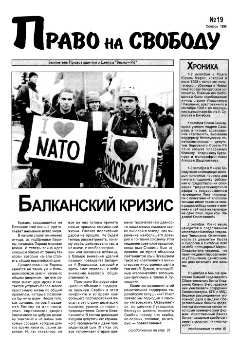 Правозащитный центр «Весна» -- неправительственная правозащитная организация, созданная в апреле 1996 года во время массовых акций протеста демократической оппозиции в Беларуси, которая после арестов участников демонстраций занималась помощью арестованным и их семьям. Поэтому первоначально организация называлась «Весна-96». 15 июня 1999 года организация была зарегистрирована как Общественное объединение «Правозащитный центр «Весна». Пре... Болей »