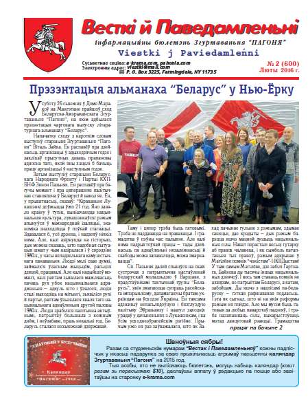 «Весткі й паведамленьні» — інфармацыйны бюлетэнь Згуртаваньня «Пагоня». Падпісацца на бюлетэнь могуць усе зацікаўленыя даслаўшы аплату гадавой падпіскі. Падпіску таксама можна аформіць, наведаўшы сайт www.ekrama.com Рэдакцыя бясплатна надрукуе прыватныя абвесткі і будзе ўдзячная за дасланыя артыкулы, водгукі й лісты. Болей »