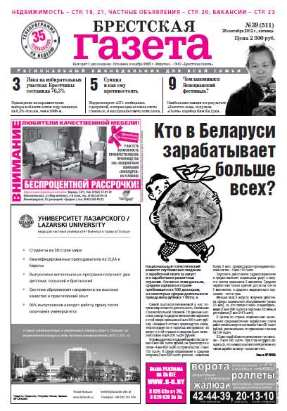 «Брестская газета» на региональном рынке СМИ позиционирует себя как одна газета для всей семьи. При выборе тематики публикуемых материалов мы руководствуемся принципом: ШИРОКИЙ ВЗГЛЯД, ВНИМАНИЕ К ДЕТАЛЯМ. При этом фундаментальной основой всех публикаций является: ОБЪЕКТИВНОСТЬ. Основными составляющими в содержательном плане являются местные новости, материалы социально-бытовой, экономической и правовой направленности. Болей »