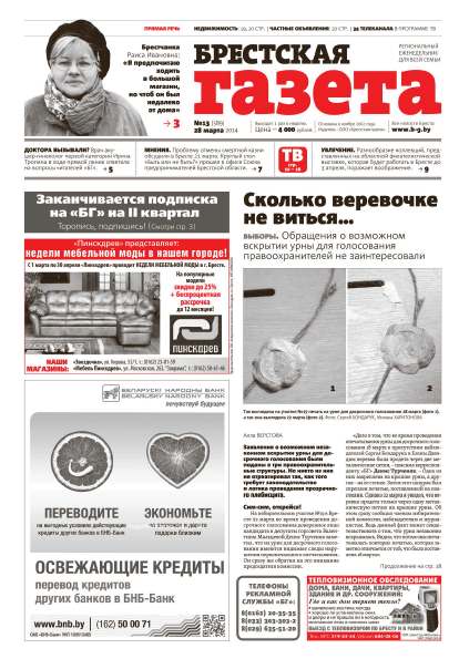 «Брестская газета» на региональном рынке СМИ позиционирует себя как одна газета для всей семьи. При выборе тематики публикуемых материалов мы руководствуемся принципом: ШИРОКИЙ ВЗГЛЯД, ВНИМАНИЕ К ДЕТАЛЯМ. При этом фундаментальной основой всех публикаций является: ОБЪЕКТИВНОСТЬ. Основными составляющими в содержательном плане являются местные новости, материалы социально-бытовой, экономической и правовой направленности. Болей »