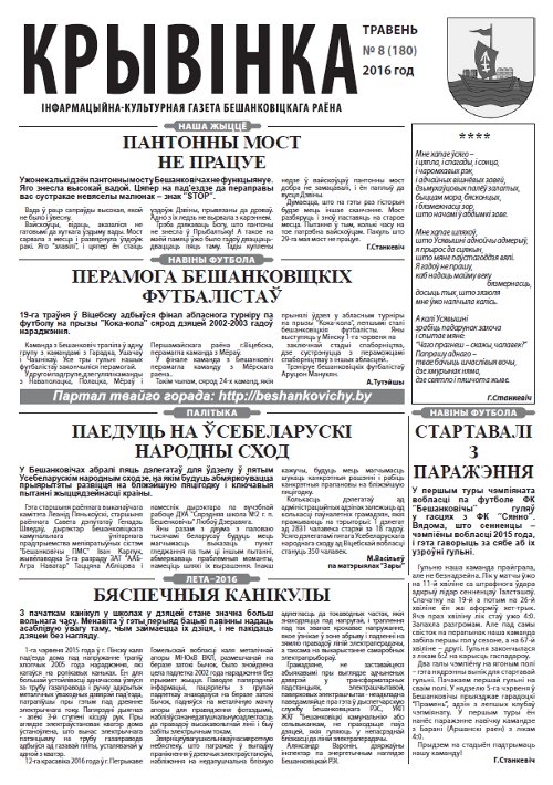 Выйшла ў свет навукова-папулярная кніга «Нарысы Бешанковіцкага краю». Выпуск выдання прымеркаваны да 575-гадовага юбілею Бешанковіч. Над яе стварэннем працавала вялікая колькасць аўтараў: Анатоль Крачкоўскі, Максім Чарняўскі, Станіслаў Леаненка, Аляксандр Вашанаў, Міхась Чарняўскі і Марына Бірукова. Старшыня райвыканкама Галіна Унуковіч адзначыла, што “Нарысы” — гэта першая спроба перадаць унікальнасць непаўторнасць прыдзвінскага кр... Болей »