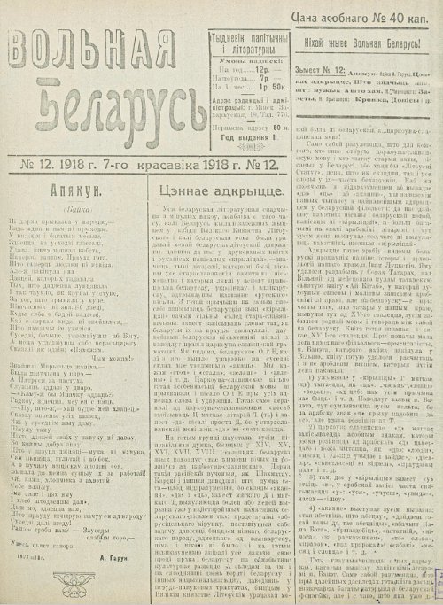 «Вольная Беларусь» — грамадска-палітычная, эканамічная і літаратурная газета. Выдавалася на беларускай мове, у Мінску (28.5 (10.6.).1917 — лістапад 1918). Рэдактар Я. Лёсік. Выдавец Беларускі нацыянальны камітэт, Мінск; з ліпеня 1917 — Таварыства беларускай культуры. У 1917 выходзіла 2 разы на тыдзень, у 1918 штотыднёвік. У 1917 развівала ідэі Беларускай Сацыялістычнай Грамады, выступала за ідэі федэралізму, аўтаноміі, пасля абвяшчэння ... Болей »