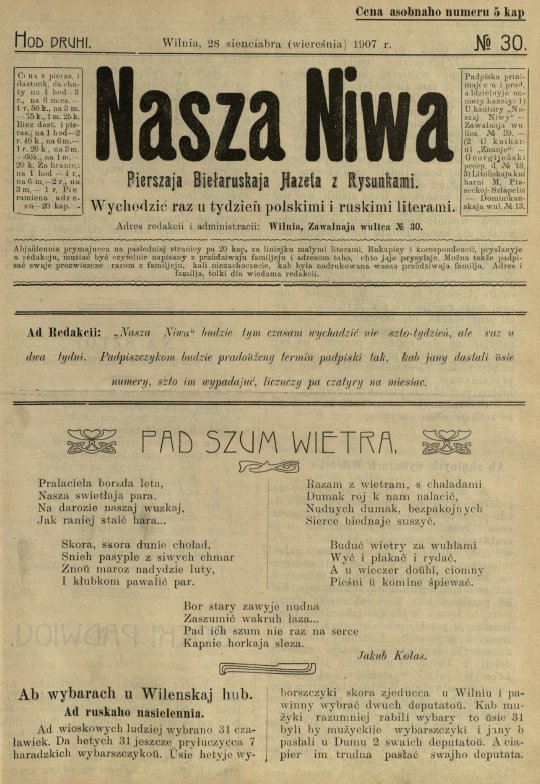 «Наша ніва» (тагач. лац. «Nasza niwa») — штотыднёвая грамадска-палітычная, навукова-асветніцкая і літаратурна-мастацкая газета нацыяльна-адраджэнскага кірунку. Выдавалася ў Вільні, па-беларуску, у перыяд 10 (23).11.1906 — 7 (20).8.1915. Друкавалася кірыліцай, да 18 (31).10.1912 таксама і лацінкай. Звычайны тыраж складаў 4.5 тыс. асобнікаў. Выхад газеты быў спынены ў сувязі з набліжэннем расійска-нямецкага фронту да Вільні. Заснавальнікі... Болей »