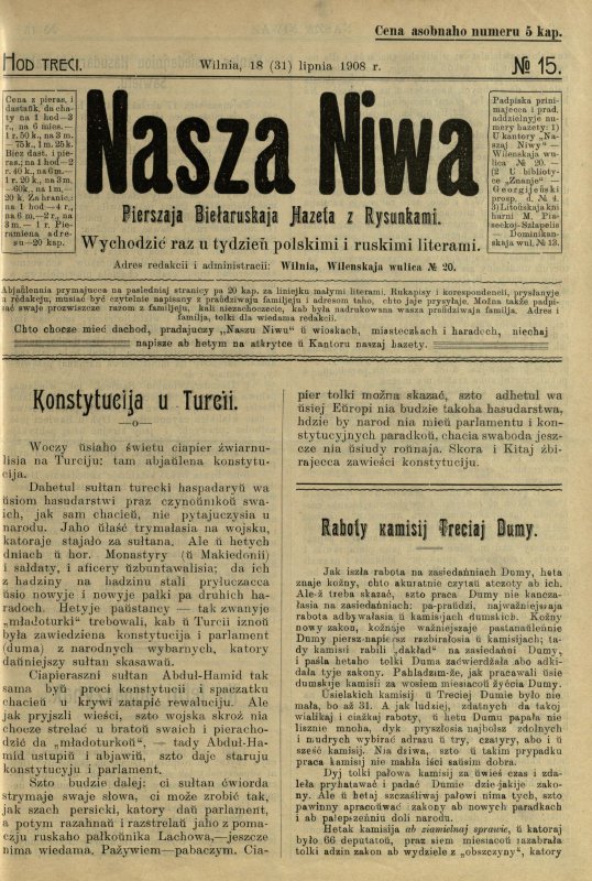 «Наша ніва» (тагач. лац. «Nasza niwa») — штотыднёвая грамадска-палітычная, навукова-асветніцкая і літаратурна-мастацкая газета нацыяльна-адраджэнскага кірунку. Выдавалася ў Вільні, па-беларуску, у перыяд 10 (23).11.1906 — 7 (20).8.1915. Друкавалася кірыліцай, да 18 (31).10.1912 таксама і лацінкай. Звычайны тыраж складаў 4.5 тыс. асобнікаў. Выхад газеты быў спынены ў сувязі з набліжэннем расійска-нямецкага фронту да Вільні. Заснавальнікі... Болей »