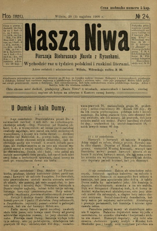 «Наша ніва» (тагач. лац. «Nasza niwa») — штотыднёвая грамадска-палітычная, навукова-асветніцкая і літаратурна-мастацкая газета нацыяльна-адраджэнскага кірунку. Выдавалася ў Вільні, па-беларуску, у перыяд 10 (23).11.1906 — 7 (20).8.1915. Друкавалася кірыліцай, да 18 (31).10.1912 таксама і лацінкай. Звычайны тыраж складаў 4.5 тыс. асобнікаў. Выхад газеты быў спынены ў сувязі з набліжэннем расійска-нямецкага фронту да Вільні. Заснавальнікі... Болей »