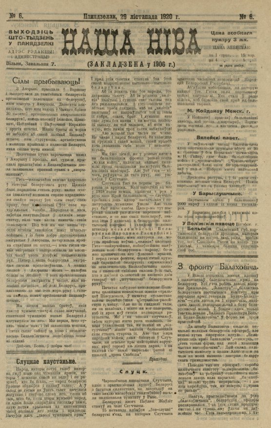 «Наша ніва». Штотыднёвая грамадска-палітычная і літаратурная газета дэмакратычнага кірунку. Другая газета з такою назвай, спроба аднаўлення аднайменнага выдання перыяду 1906—1915. Выдавалася ў Вільні, у беларускай мове, у перыяд 1920-10-28 — 1920-12-20. Агулам выйшла 9 нумароў. Рэдактар — У. Знамяроўскі, з 3-га нумару. Газета асвятляла падзеі, звязаныя з акупацыяй Беларусі польскімі войскамі і падрыхтоўкай яе падзелу між суседнімі дзярж... Болей »