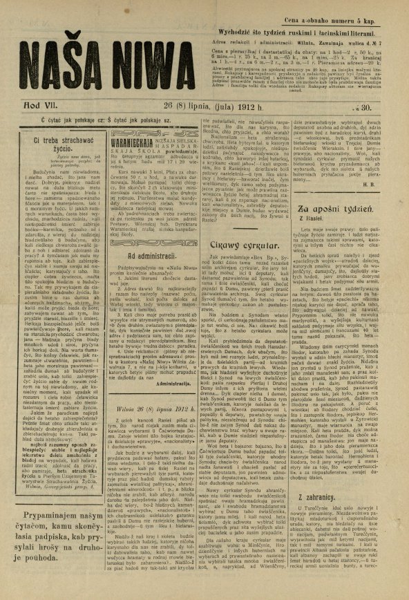 «Наша ніва» (тагач. лац. «Nasza niwa») — штотыднёвая грамадска-палітычная, навукова-асветніцкая і літаратурна-мастацкая газета нацыяльна-адраджэнскага кірунку. Выдавалася ў Вільні, па-беларуску, у перыяд 10 (23).11.1906 — 7 (20).8.1915. Друкавалася кірыліцай, да 18 (31).10.1912 таксама і лацінкай. Звычайны тыраж складаў 4.5 тыс. асобнікаў. Выхад газеты быў спынены ў сувязі з набліжэннем расійска-нямецкага фронту да Вільні. Заснавальнікі... Болей »