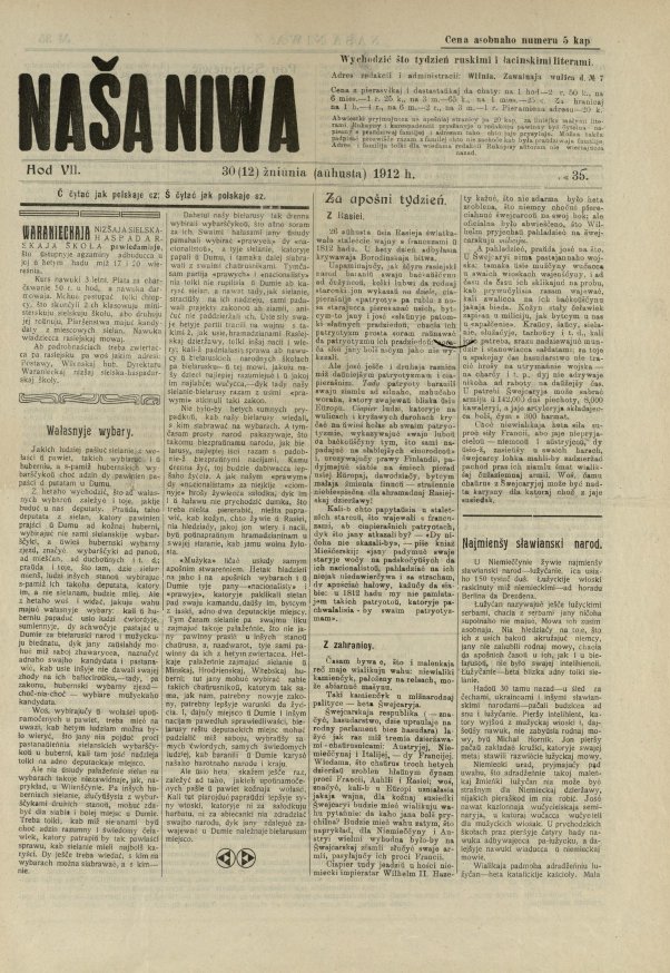 «Наша ніва» (тагач. лац. «Nasza niwa») — штотыднёвая грамадска-палітычная, навукова-асветніцкая і літаратурна-мастацкая газета нацыяльна-адраджэнскага кірунку. Выдавалася ў Вільні, па-беларуску, у перыяд 10 (23).11.1906 — 7 (20).8.1915. Друкавалася кірыліцай, да 18 (31).10.1912 таксама і лацінкай. Звычайны тыраж складаў 4.5 тыс. асобнікаў. Выхад газеты быў спынены ў сувязі з набліжэннем расійска-нямецкага фронту да Вільні. Заснавальнікі... Болей »
