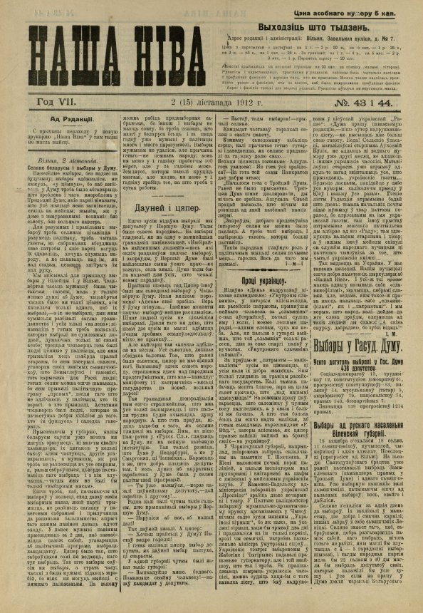 «Наша ніва» (тагач. лац. «Nasza niwa») — штотыднёвая грамадска-палітычная, навукова-асветніцкая і літаратурна-мастацкая газета нацыяльна-адраджэнскага кірунку. Выдавалася ў Вільні, па-беларуску, у перыяд 10 (23).11.1906 — 7 (20).8.1915. Друкавалася кірыліцай, да 18 (31).10.1912 таксама і лацінкай. Звычайны тыраж складаў 4.5 тыс. асобнікаў. Выхад газеты быў спынены ў сувязі з набліжэннем расійска-нямецкага фронту да Вільні. Заснавальнікі... Болей »