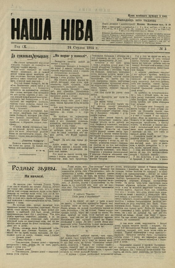 «Наша ніва» (тагач. лац. «Nasza niwa») — штотыднёвая грамадска-палітычная, навукова-асветніцкая і літаратурна-мастацкая газета нацыяльна-адраджэнскага кірунку. Выдавалася ў Вільні, па-беларуску, у перыяд 10 (23).11.1906 — 7 (20).8.1915. Друкавалася кірыліцай, да 18 (31).10.1912 таксама і лацінкай. Звычайны тыраж складаў 4.5 тыс. асобнікаў. Выхад газеты быў спынены ў сувязі з набліжэннем расійска-нямецкага фронту да Вільні. Заснавальнікі... Болей »