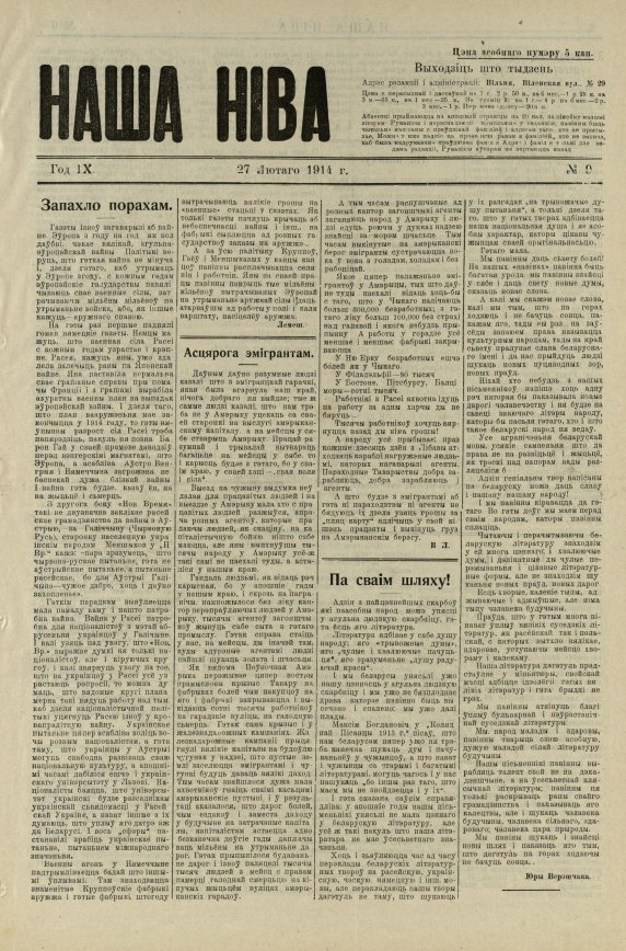 «Наша ніва» (тагач. лац. «Nasza niwa») — штотыднёвая грамадска-палітычная, навукова-асветніцкая і літаратурна-мастацкая газета нацыяльна-адраджэнскага кірунку. Выдавалася ў Вільні, па-беларуску, у перыяд 10 (23).11.1906 — 7 (20).8.1915. Друкавалася кірыліцай, да 18 (31).10.1912 таксама і лацінкай. Звычайны тыраж складаў 4.5 тыс. асобнікаў. Выхад газеты быў спынены ў сувязі з набліжэннем расійска-нямецкага фронту да Вільні. Заснавальнікі... Болей »