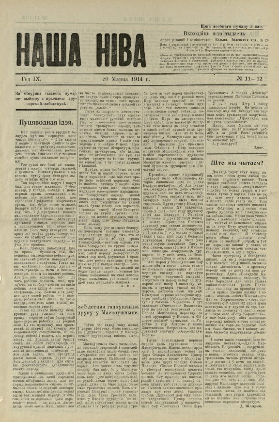«Наша ніва» (тагач. лац. «Nasza niwa») — штотыднёвая грамадска-палітычная, навукова-асветніцкая і літаратурна-мастацкая газета нацыяльна-адраджэнскага кірунку. Выдавалася ў Вільні, па-беларуску, у перыяд 10 (23).11.1906 — 7 (20).8.1915. Друкавалася кірыліцай, да 18 (31).10.1912 таксама і лацінкай. Звычайны тыраж складаў 4.5 тыс. асобнікаў. Выхад газеты быў спынены ў сувязі з набліжэннем расійска-нямецкага фронту да Вільні. Заснавальнікі... Болей »