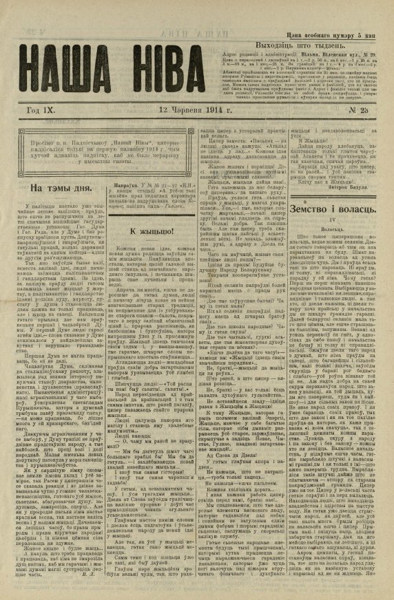 «Наша ніва» (тагач. лац. «Nasza niwa») — штотыднёвая грамадска-палітычная, навукова-асветніцкая і літаратурна-мастацкая газета нацыяльна-адраджэнскага кірунку. Выдавалася ў Вільні, па-беларуску, у перыяд 10 (23).11.1906 — 7 (20).8.1915. Друкавалася кірыліцай, да 18 (31).10.1912 таксама і лацінкай. Звычайны тыраж складаў 4.5 тыс. асобнікаў. Выхад газеты быў спынены ў сувязі з набліжэннем расійска-нямецкага фронту да Вільні. Заснавальнікі... Болей »