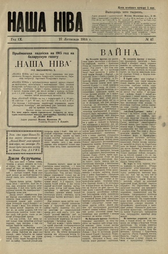 «Наша ніва» (тагач. лац. «Nasza niwa») — штотыднёвая грамадска-палітычная, навукова-асветніцкая і літаратурна-мастацкая газета нацыяльна-адраджэнскага кірунку. Выдавалася ў Вільні, па-беларуску, у перыяд 10 (23).11.1906 — 7 (20).8.1915. Друкавалася кірыліцай, да 18 (31).10.1912 таксама і лацінкай. Звычайны тыраж складаў 4.5 тыс. асобнікаў. Выхад газеты быў спынены ў сувязі з набліжэннем расійска-нямецкага фронту да Вільні. Заснавальнікі... Болей »
