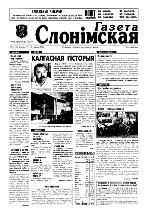 «Газета Слонімская» (скарочана «ГС», польск. Gazeta Słonimska) — беларуская штотыднёвая грамадска-палітычная газета, якая выходзіць у Слоніме. Упершыню выйшла ў 1938 годзе на польскай мове (ўсяго выйшла 4 нумары). «Газета Слонімская» была адноўленая ў 1997 годзе як незалежнае грамадска-палітычнае выданне на рускай і беларускай мовах. Яе заснавальнікам і галоўным рэдактарам стаў Віктар Валадашчук. Першы нумар адроджанай «Газеты Слонімска... Болей »