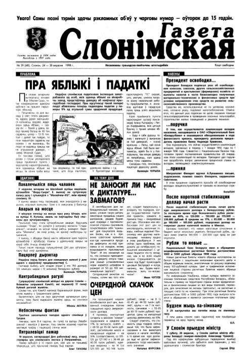 Газета Слонімская, 39 (68) 1998