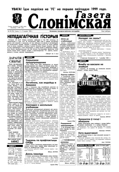 «Газета Слонімская» (скарочана «ГС», польск. Gazeta Słonimska) — беларуская штотыднёвая грамадска-палітычная газета, якая выходзіць у Слоніме. Упершыню выйшла ў 1938 годзе на польскай мове (ўсяго выйшла 4 нумары). «Газета Слонімская» была адноўленая ў 1997 годзе як незалежнае грамадска-палітычнае выданне на рускай і беларускай мовах. Яе заснавальнікам і галоўным рэдактарам стаў Віктар Валадашчук. Першы нумар адроджанай «Газеты Слонімска... Болей »