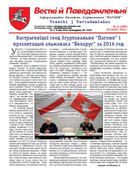 Усуботу, 15 кастрычніка 2016 года, у Доме Маракоў на Мангэтане ў Нью-Ёрку прайшоў сход Беларуска-Амэрыканскага Згуртаваньня “Пагоня”, на якім адбылася прэзэнтацыя чарговага выпуску літаратурнага альманаху “Беларус”. Напачатку сходу старшыня Згуртаваньня “Пагоня” сп. Віталь Зайка прывітаў прысутных і коратка распавёў пра дзейнасьць арганізацыі, пра маючыя адбыцца імпрэзы, у тым ліку сьвяткаваньне ўгодкаў Слуцкага Збройнага Чыну, што пройдзе на адным з наступных сходаў – дзеля падрабязьнейшай і апэратыўнейшай інфармацыі сачыце за абвесткамі на старонцы “Пагоні” у Фэйсбуку і за сайтам арганізацыі. Затым сп. Зайка перадаў слова рэдактару і выдаўцу альманаху “Беларус”, які таксама рэдагуе інфармацыйны бюлетэнь Згуртаваньня “Весткі й Паведамленьні”, сп. Марату Клакоцкаму.