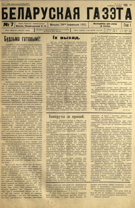 «Беларуская газэта» — заходнебеларуская грамадзка-палітычная газэта. Неафіцыйны орган КПЗБ, які легальна выдаваўся ў Заходняй Беларусі ў Вільні з 8 чэрвеня 1933 да 19 студзеня 1934 году на беларускай мове 2 разы ў месяц у час т. зв. «жэста ўзаемапавагі» польскіх улад да СССР пасля падпісання ў 1932 пакта аб ненападзе. Рэдактар-выдавец: А. Карповіч. Прапагандавала сацыялізм, уз’яднанне Заходняй Беларусі з БССР, выступала супраць фашызацы... Болей »
