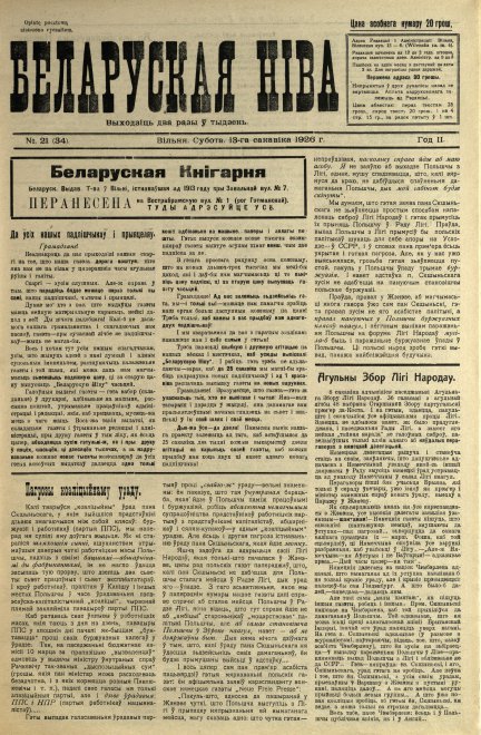 «Беларуская ніва» — газета рэвалюцыйна-дэмакратычнага кірунку, неафіцыйны орган Беларускай сялянска-работніцкай грамады (БСРГ). Выдавалася на беларускай мове 3 разы на тыдзень у Вільні з 18 лістапада 1925 да канца 1926. Працягвала праграму газеты «Беларуская доля». Рэдактар-выдавец Я. Марцінеўскі, фактычны палітычны рэдактар, член ЦК КПЗБ Я. С. Бабровіч. У склад рэдакцыі ўваходзілі П. В. Мятла, С. А. Рак-Міхайлоўскі, Б. А. Тарашкевіч. М... Болей »