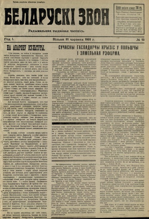 «Беларускі звон», штотыднёвая газета, орган «Цэнтральнага саюза культурных і гаспадарчых арганізацый» (Цэнтрасаюза). Выдавалася ў Вільні на беларускай мове з 6 студзеня 1931 да 2 сьнежня 1932. Замяніла газету «Наперад». Рэдактар-выдавец М. Сіняўскі. Агулам выйшла 58 нумароў. Газета пісала мра эканамічны крызіс, крытыкавала рэпрэсіі ў СССР, асуджала фізічны і маральны тэрор супраць дзеячаў навукі, культуры і літаратуры ў БССР. Паведамлял... Болей »