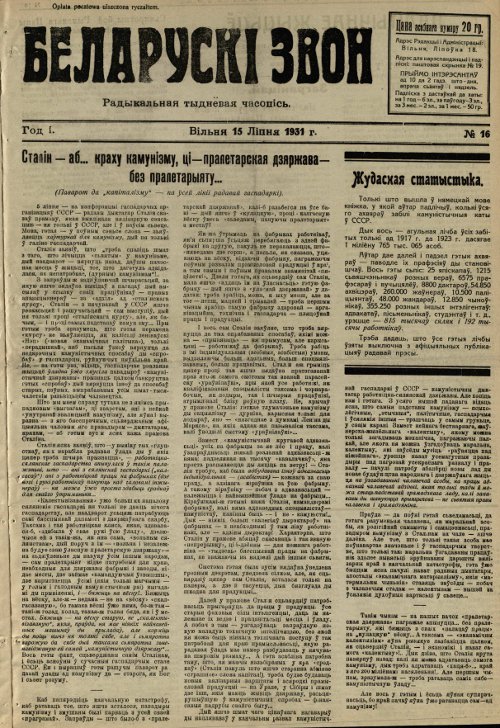 «Беларускі звон», штотыднёвая газета, орган «Цэнтральнага саюза культурных і гаспадарчых арганізацый» (Цэнтрасаюза). Выдавалася ў Вільні на беларускай мове з 6 студзеня 1931 да 2 сьнежня 1932. Замяніла газету «Наперад». Рэдактар-выдавец М. Сіняўскі. Агулам выйшла 58 нумароў. Газета пісала мра эканамічны крызіс, крытыкавала рэпрэсіі ў СССР, асуджала фізічны і маральны тэрор супраць дзеячаў навукі, культуры і літаратуры ў БССР. Паведамлял... Болей »