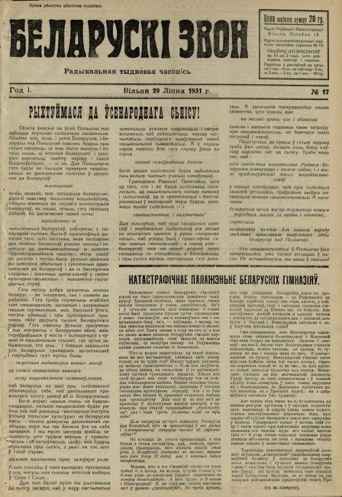 «Беларускі звон», штотыднёвая газета, орган «Цэнтральнага саюза культурных і гаспадарчых арганізацый» (Цэнтрасаюза). Выдавалася ў Вільні на беларускай мове з 6 студзеня 1931 да 2 сьнежня 1932. Замяніла газету «Наперад». Рэдактар-выдавец М. Сіняўскі. Агулам выйшла 58 нумароў. Газета пісала мра эканамічны крызіс, крытыкавала рэпрэсіі ў СССР, асуджала фізічны і маральны тэрор супраць дзеячаў навукі, культуры і літаратуры ў БССР. Паведамлял... Болей »
