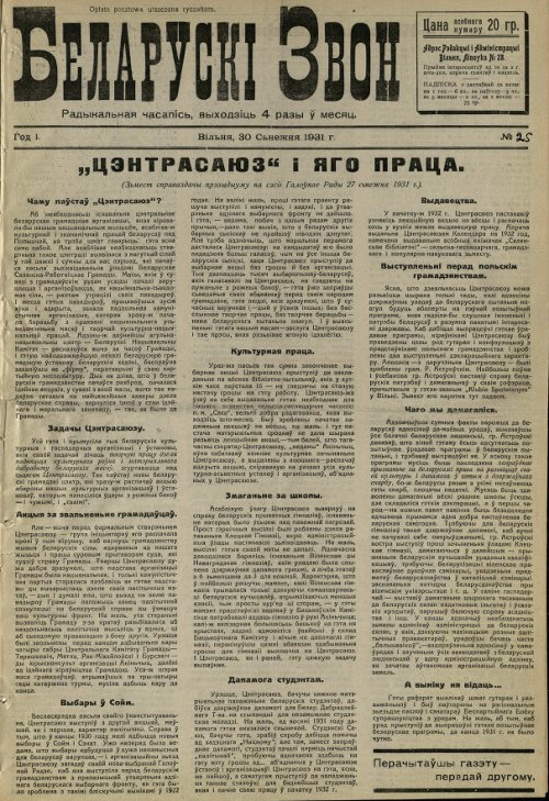 «Беларускі звон», штотыднёвая газета, орган «Цэнтральнага саюза культурных і гаспадарчых арганізацый» (Цэнтрасаюза). Выдавалася ў Вільні на беларускай мове з 6 студзеня 1931 да 2 сьнежня 1932. Замяніла газету «Наперад». Рэдактар-выдавец М. Сіняўскі. Агулам выйшла 58 нумароў. Газета пісала мра эканамічны крызіс, крытыкавала рэпрэсіі ў СССР, асуджала фізічны і маральны тэрор супраць дзеячаў навукі, культуры і літаратуры ў БССР. Паведамлял... Болей »
