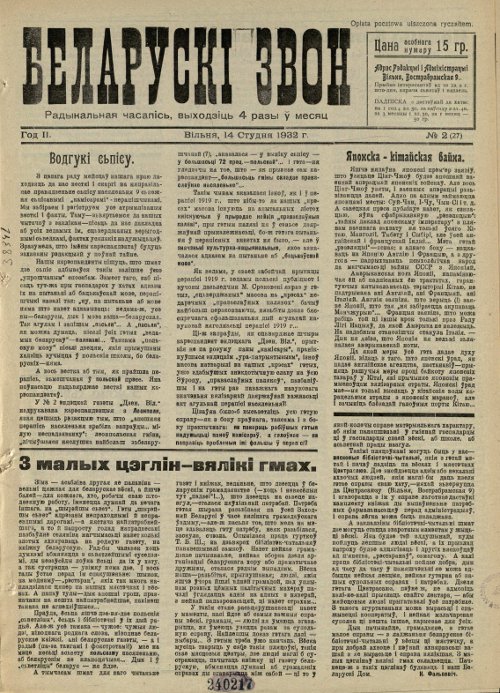 «Беларускі звон», штотыднёвая газета, орган «Цэнтральнага саюза культурных і гаспадарчых арганізацый» (Цэнтрасаюза). Выдавалася ў Вільні на беларускай мове з 6 студзеня 1931 да 2 сьнежня 1932. Замяніла газету «Наперад». Рэдактар-выдавец М. Сіняўскі. Агулам выйшла 58 нумароў. Газета пісала мра эканамічны крызіс, крытыкавала рэпрэсіі ў СССР, асуджала фізічны і маральны тэрор супраць дзеячаў навукі, культуры і літаратуры ў БССР. Паведамлял... Болей »