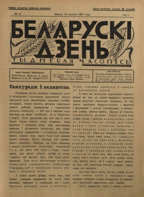 «Беларускі дзень» (7 сакавіка 1927 — 1928) — штотыднёвая грамадзка-палітычная, сельскагаспадарчая і літаратурная газэта. Выдавалася ў Вільні. Рэдактар-выдавец Францішак Умястоўскі. У дэкларацыі «Да беларускага сялянства!» (1927. № 1) гаварылася, што газета з’яўляецца незалежна-сялянскай, будзе абараняць палітычныя правы беларускага селяніна, народную культуру і школу, дапамагаць сялянам агранамічнымі, сельскагаспадарчымі і юрыдычнымі па... More »