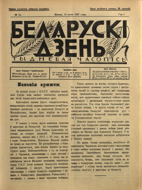 «Беларускі дзень» (7 сакавіка 1927 — 1928) — штотыднёвая грамадзка-палітычная, сельскагаспадарчая і літаратурная газэта. Выдавалася ў Вільні. Рэдактар-выдавец Францішак Умястоўскі. У дэкларацыі «Да беларускага сялянства!» (1927. № 1) гаварылася, што газета з’яўляецца незалежна-сялянскай, будзе абараняць палітычныя правы беларускага селяніна, народную культуру і школу, дапамагаць сялянам агранамічнымі, сельскагаспадарчымі і юрыдычнымі па... More »
