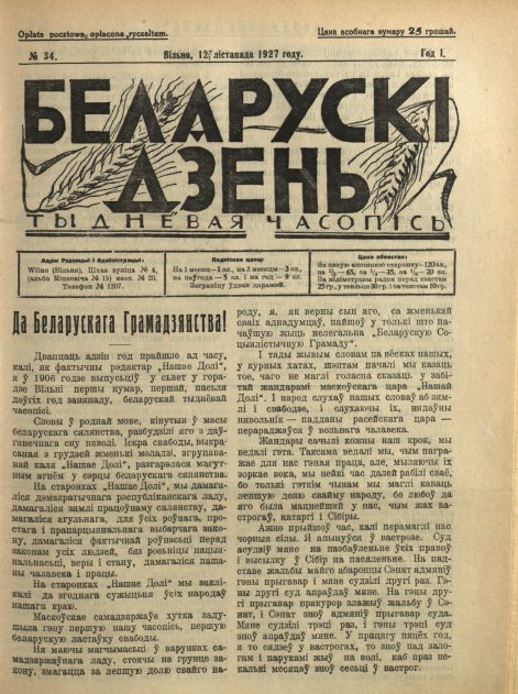«Беларускі дзень» (7 сакавіка 1927 — 1928) — штотыднёвая грамадзка-палітычная, сельскагаспадарчая і літаратурная газэта. Выдавалася ў Вільні. Рэдактар-выдавец Францішак Умястоўскі. У дэкларацыі «Да беларускага сялянства!» (1927. № 1) гаварылася, што газета з’яўляецца незалежна-сялянскай, будзе абараняць палітычныя правы беларускага селяніна, народную культуру і школу, дапамагаць сялянам агранамічнымі, сельскагаспадарчымі і юрыдычнымі па... Болей »