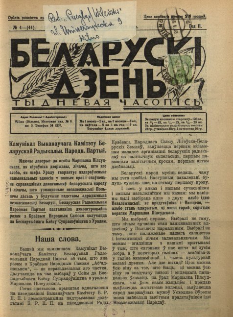 «Беларускі дзень» (7 сакавіка 1927 — 1928) — штотыднёвая грамадзка-палітычная, сельскагаспадарчая і літаратурная газэта. Выдавалася ў Вільні. Рэдактар-выдавец Францішак Умястоўскі. У дэкларацыі «Да беларускага сялянства!» (1927. № 1) гаварылася, што газета з’яўляецца незалежна-сялянскай, будзе абараняць палітычныя правы беларускага селяніна, народную культуру і школу, дапамагаць сялянам агранамічнымі, сельскагаспадарчымі і юрыдычнымі па... Болей »