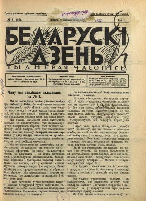 «Беларускі дзень» (7 сакавіка 1927 — 1928) — штотыднёвая грамадзка-палітычная, сельскагаспадарчая і літаратурная газэта. Выдавалася ў Вільні. Рэдактар-выдавец Францішак Умястоўскі. У дэкларацыі «Да беларускага сялянства!» (1927. № 1) гаварылася, што газета з’яўляецца незалежна-сялянскай, будзе абараняць палітычныя правы беларускага селяніна, народную культуру і школу, дапамагаць сялянам агранамічнымі, сельскагаспадарчымі і юрыдычнымі па... Болей »