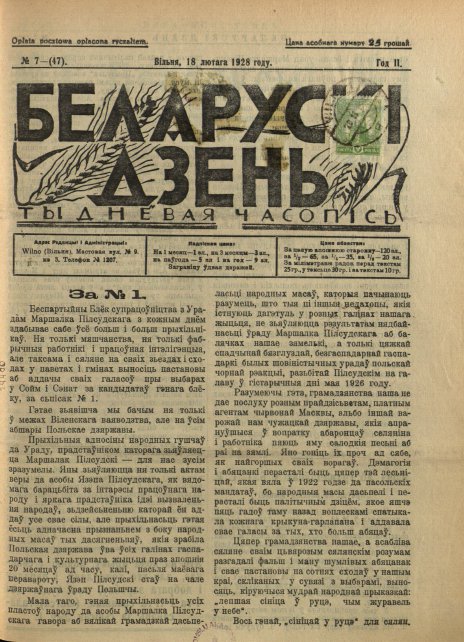 «Беларускі дзень» (7 сакавіка 1927 — 1928) — штотыднёвая грамадзка-палітычная, сельскагаспадарчая і літаратурная газэта. Выдавалася ў Вільні. Рэдактар-выдавец Францішак Умястоўскі. У дэкларацыі «Да беларускага сялянства!» (1927. № 1) гаварылася, што газета з’яўляецца незалежна-сялянскай, будзе абараняць палітычныя правы беларускага селяніна, народную культуру і школу, дапамагаць сялянам агранамічнымі, сельскагаспадарчымі і юрыдычнымі па... Болей »