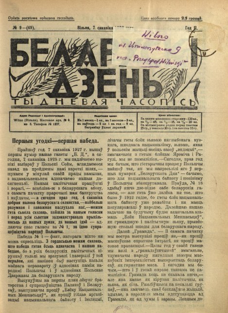 «Беларускі дзень» (7 сакавіка 1927 — 1928) — штотыднёвая грамадзка-палітычная, сельскагаспадарчая і літаратурная газэта. Выдавалася ў Вільні. Рэдактар-выдавец Францішак Умястоўскі. У дэкларацыі «Да беларускага сялянства!» (1927. № 1) гаварылася, што газета з’яўляецца незалежна-сялянскай, будзе абараняць палітычныя правы беларускага селяніна, народную культуру і школу, дапамагаць сялянам агранамічнымі, сельскагаспадарчымі і юрыдычнымі па... Болей »