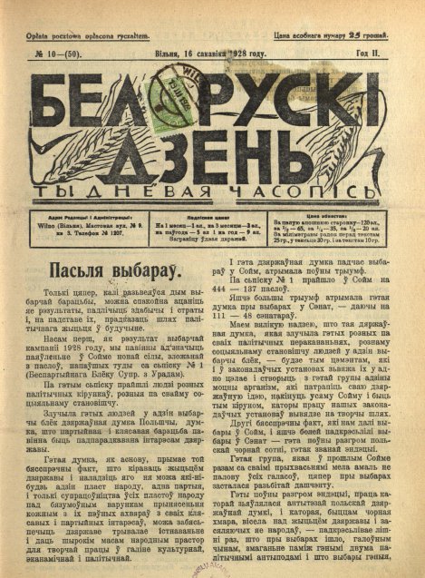 «Беларускі дзень» (7 сакавіка 1927 — 1928) — штотыднёвая грамадзка-палітычная, сельскагаспадарчая і літаратурная газэта. Выдавалася ў Вільні. Рэдактар-выдавец Францішак Умястоўскі. У дэкларацыі «Да беларускага сялянства!» (1927. № 1) гаварылася, што газета з’яўляецца незалежна-сялянскай, будзе абараняць палітычныя правы беларускага селяніна, народную культуру і школу, дапамагаць сялянам агранамічнымі, сельскагаспадарчымі і юрыдычнымі па... Болей »