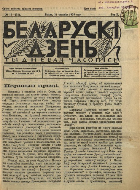 «Беларускі дзень» (7 сакавіка 1927 — 1928) — штотыднёвая грамадзка-палітычная, сельскагаспадарчая і літаратурная газэта. Выдавалася ў Вільні. Рэдактар-выдавец Францішак Умястоўскі. У дэкларацыі «Да беларускага сялянства!» (1927. № 1) гаварылася, што газета з’яўляецца незалежна-сялянскай, будзе абараняць палітычныя правы беларускага селяніна, народную культуру і школу, дапамагаць сялянам агранамічнымі, сельскагаспадарчымі і юрыдычнымі па... More »