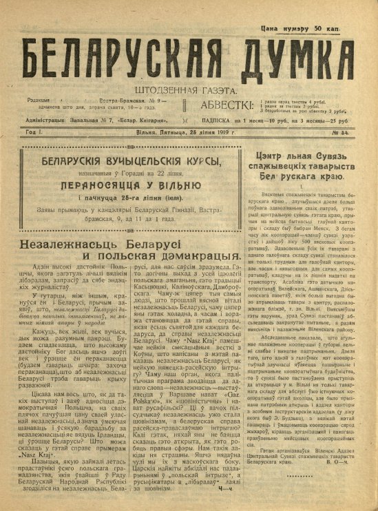 «Беларуская думка» — газета дэмакратычнага кірунку. Выдавалася з 28 красавіка да 27 ліпеня 1919 у Вільні на беларускай мове. Выходзіла 3 разы на тыдзень. Рэдактары I. Вайцяховіч, У. Знамяроўскі, Э. Падгайскі. У газеце супрацоўнічалі прадстаўнікі радыкальнай інтэлігенцыі пераважна сацыялістычнай арыентацыі. Мела рубрыкі «Беларусь» (з месцаў), «Апошнія навіны», «3 газет», «У Вільні» і інш. Паслядоўна выступала за цэласнасць і непадзельнас... Болей »