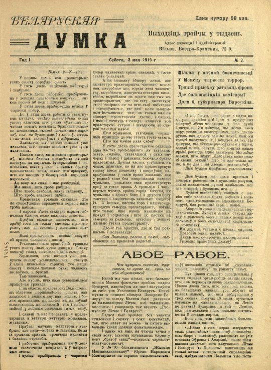 «Беларуская думка» — газета дэмакратычнага кірунку. Выдавалася з 28 красавіка да 27 ліпеня 1919 у Вільні на беларускай мове. Выходзіла 3 разы на тыдзень. Рэдактары I. Вайцяховіч, У. Знамяроўскі, Э. Падгайскі. У газеце супрацоўнічалі прадстаўнікі радыкальнай інтэлігенцыі пераважна сацыялістычнай арыентацыі. Мела рубрыкі «Беларусь» (з месцаў), «Апошнія навіны», «3 газет», «У Вільні» і інш. Паслядоўна выступала за цэласнасць і непадзельнас... Болей »