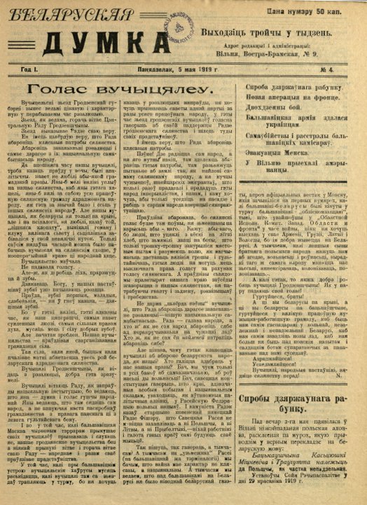 «Беларуская думка» — газета дэмакратычнага кірунку. Выдавалася з 28 красавіка да 27 ліпеня 1919 у Вільні на беларускай мове. Выходзіла 3 разы на тыдзень. Рэдактары I. Вайцяховіч, У. Знамяроўскі, Э. Падгайскі. У газеце супрацоўнічалі прадстаўнікі радыкальнай інтэлігенцыі пераважна сацыялістычнай арыентацыі. Мела рубрыкі «Беларусь» (з месцаў), «Апошнія навіны», «3 газет», «У Вільні» і інш. Паслядоўна выступала за цэласнасць і непадзельнас... Болей »