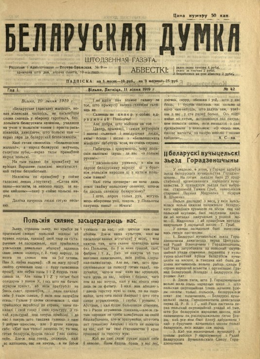 «Беларуская думка» — газета дэмакратычнага кірунку. Выдавалася з 28 красавіка да 27 ліпеня 1919 у Вільні на беларускай мове. Выходзіла 3 разы на тыдзень. Рэдактары I. Вайцяховіч, У. Знамяроўскі, Э. Падгайскі. У газеце супрацоўнічалі прадстаўнікі радыкальнай інтэлігенцыі пераважна сацыялістычнай арыентацыі. Мела рубрыкі «Беларусь» (з месцаў), «Апошнія навіны», «3 газет», «У Вільні» і інш. Паслядоўна выступала за цэласнасць і непадзельнас... Болей »