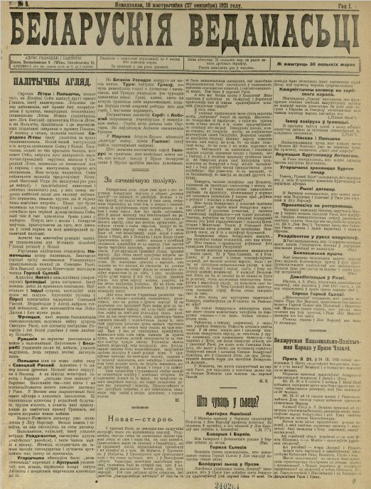 «Беларускія ведамасьці» — віленская беларуская газэта, якая выходзіла ад 14 верасьня 1921 да 15 студзеня 1922 гадоў. Выдавалася замест газэты «Наша думка», забароненай уладамі Сярэдняе Літвы. Рэдактарам-выдаўцом быў Максім Гарэцкі. Зачыненая напярэдадні выбараў у Віленскі сойм за публікацыі, скіраваныя супраць далучэньня Віленшчыны да Польшчы. Гарэцкі быў зьняволены ў Лукіскай турме, потым дэпартаваны зь Вільні. Усяго выйшла 19 нумароў.... Болей »