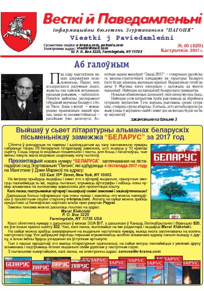 «Весткі й паведамленьні» — інфармацыйны бюлетэнь Згуртаваньня «Пагоня». Падпісацца на бюлетэнь могуць усе зацікаўленыя даслаўшы аплату гадавой падпіскі. Падпіску таксама можна аформіць, наведаўшы сайт www.ekrama.com Рэдакцыя бясплатна надрукуе прыватныя абвесткі і будзе ўдзячная за дасланыя артыкулы, водгукі й лісты. Болей »
