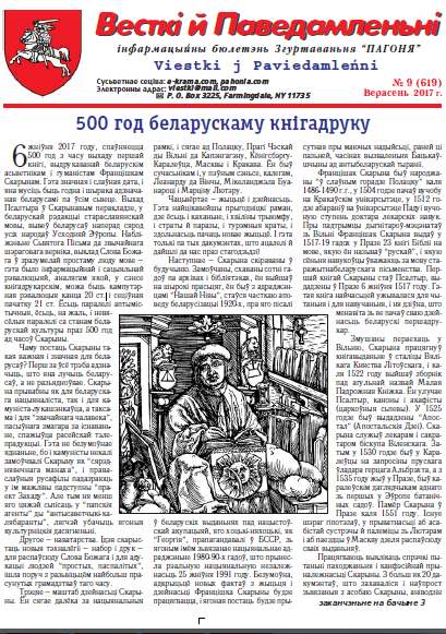 6 жніўня 2017 году, спаўняецца 500 год з часу выхаду першай кнігі, выдрукаванай беларускім асьветнікам і гуманістам Францішкам Скарынам. Гэта значная і слаўная дата, і яна мусіць быць годна і шырака адзначаная беларусамі па ўсім сьвеце. Выхад Псалтыра ў Скарынавым перакладзе, у беларускай рэдакцыі стараславянскай мовы, вывеў беларусаў наперад сярод усіх народаў Усходняй Эўропы. Набліжэньне Сьвятога Пісьма да звычайнага шэраговага верніка, выклад Слова Божага ў зразумелай простаму люду мове – гэта было інфармацыйнай і сацыяльнай рэвалюцыяй, аналягам якой, у сэнсе кнігадрукарскім, можа быць кампутэрная рэвалюцыя канца 20 ст.