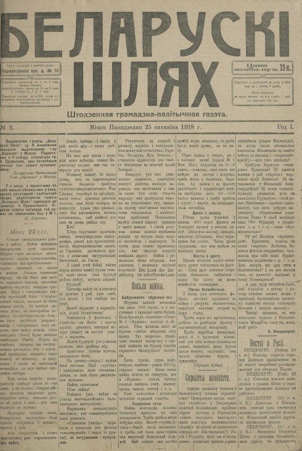 «Беларускі шлях» — штодзённая грамадска-палітычная газета на беларускай мове. Выдавалася ў Мінску ва ўмовах нямецкай акупацыі. Рэдактар-выдавец №1 П. Аляксюк; з №2 да канца выдання рэдактар А. Прушынскі (А. Гарун), выдавец — таварыства «Заранка» (старшыня П. Аляксюк, пісар А. Уласаў). Супрацоўнічала з газетай «Вольная Беларусь» (мела агульных аўтараў, абменьвалася матэрыяламі). Мэта выдання — сацыяльна-эканамічнае і культурнае адраджэнн... Болей »