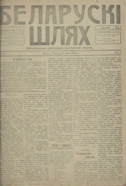 «Беларускі шлях» — штодзённая грамадска-палітычная газета на беларускай мове. Выдавалася ў Мінску ва ўмовах нямецкай акупацыі. Рэдактар-выдавец №1 П. Аляксюк; з №2 да канца выдання рэдактар А. Прушынскі (А. Гарун), выдавец — таварыства «Заранка» (старшыня П. Аляксюк, пісар А. Уласаў). Супрацоўнічала з газетай «Вольная Беларусь» (мела агульных аўтараў, абменьвалася матэрыяламі). Мэта выдання — сацыяльна-эканамічнае і культурнае адраджэнн... Болей »