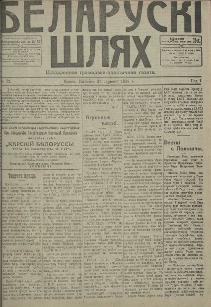 «Беларускі шлях» — штодзённая грамадска-палітычная газета на беларускай мове. Выдавалася ў Мінску ва ўмовах нямецкай акупацыі. Рэдактар-выдавец №1 П. Аляксюк; з №2 да канца выдання рэдактар А. Прушынскі (А. Гарун), выдавец — таварыства «Заранка» (старшыня П. Аляксюк, пісар А. Уласаў). Супрацоўнічала з газетай «Вольная Беларусь» (мела агульных аўтараў, абменьвалася матэрыяламі). Мэта выдання — сацыяльна-эканамічнае і культурнае адраджэнн... Болей »