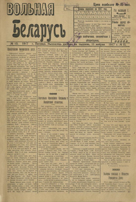 «Вольная Беларусь» — грамадска-палітычная, эканамічная і літаратурная газета. Выдавалася на беларускай мове, у Мінску (28.5 (10.6.).1917 — лістапад 1918). Рэдактар Я. Лёсік. Выдавец Беларускі нацыянальны камітэт, Мінск; з ліпеня 1917 — Таварыства беларускай культуры. У 1917 выходзіла 2 разы на тыдзень, у 1918 штотыднёвік. У 1917 развівала ідэі Беларускай Сацыялістычнай Грамады, выступала за ідэі федэралізму, аўтаноміі, пасля абвяшчэння ... Болей »